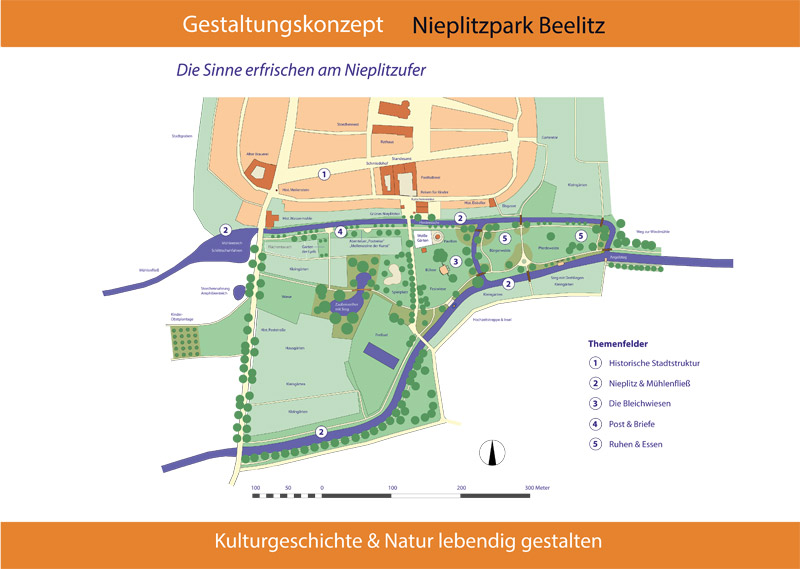 Nieplitzpark Beelitz & Freiraumkonzept „Grüne Ringe“Modellhaftes Gesamtprojekt mit überregionaler Ausstrahlung Aufgrund der engen Verbindung von Kultur und Natur besitzt das Projekt eine hohe Attraktivität für den Tourismus und die Naherholung in der Region. Die Wiedereröffnung des Mühlenfließes und des alten Nieplitzarmes als Teil des Parkes kann für die gesamte Nieplitz als modellhaftes Vorhaben gelten. Die Vernetzung des Gesamtprojekts mit der “Spargelstraße” bietet ein großes Potenzial für touristische und wirtschaftliche Synergieeffekte. Die Stadt Beelitz besitzt mit ihrem markanten Stadtkern und der kompakten Stadterwei-terung eine einmalige Verbindung zum Landschaftsraum, die durch den Nieplitzpark und die Grünen Ringe als Modellprojekt mit überregionaler Ausstrahlung weiterentwickelt werden kann. Die erlebbare Beziehung von Kulturgeschichte und sinnvoller Nutzung der “Kulturlandschaft” ist hierbei ein wesentlicher Aspekt. So wie einst der “Beelitzer Ackerbürger” eine enge Verbindung zur Landschaft hatte, rückt heute der Wert des ländlichen Raumes für die Stadtbewohner und Besucher ins Bewusstsein. Der Nieplitzpark Beelitz Bei der Recherche und gestaltungsbezogenen Auswertung der Kulturgeschichte kamen neue Erkenntnisse zutage, wie z. B. die bislang unbekannte Lage eines Altarmes der Nieplitz und die mittelalterliche Stadtstruktur, die für die Planung interessant sind. Mit der Öffnung dieses Gewässerabschnittes und dem historischen Mühlenfließ wird ein Teil des Parks eine attraktive Insellage mit Brücken und vielfältigen Wasserzugängen erhalten. Das Thema der Bleichwiesen wird in den “Weißen Gärten”, dem textilen Bleichpavillion und der Parkbühne aufgenommen. Auf dem Standort der historischen Weide können heute Postkutschenpferde weiden und auf der “Bürgerweide” bieten sich neben Hochbeeten mit essbaren Pflanzen ruhige Sitz- und Liegeflächen an. Zum Thema der Postroute sind verschiedene Elemente geplant, die einen lebendigen Einblick in die Zeit der Postkutschen geben sowie der “Garten der Lyrik” als Anregung zum Thema des Briefes und der Kommu-nikation. Die kulturhistorischen Themen sind als Informationstafeln in unterhaltsamer Form von “Briefen aus der Vergangenheit” vorgesehen. Der Nieplitzpark als inklusiver Bürgerpark beinhaltet Angebote für verschiedene Altersstufen, wie die Hochzeitstreppe, Parkbühne, Schülergarten und Ruhebereiche für ältere Menschen ebenso wie für Menschen mit Behinderungen. Ökologische Zusammenhänge und Artenschutz werden ebenso beachtet, wie z.B. die Schaffung von optimalen Lebensräumen für den Steinkauz und Storch. Mit dem geplanten erweiterten Wegenetz verbindet der Nieplitzpark die Altstadt mit der offenen Landschaft und schafft mit dem Freiraumsystem der “Grünen Ringe” eine nachhaltige Infrastruktur. Freiraumkonzept „Grüne Ringe“ In direkter Anbindung an den Bahnhof startet der äußere “Landschaftsring” am Wasserturm. Die für Beelitz typische Landschaftsvielfalt aus Kiefernwäldern, Spargelsandern und der Nieplitzniederung wird hierbei erlebbar. Der “Altstadtring” führt durch Kleingärten, den Nieplitzpark und die historische Wassermühle um die mittelalterliche Stadt.