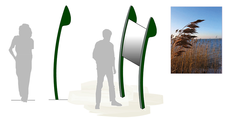 Designobjekt Schilfstelen – organische Formen für die Hafenpromenade der Havelauen WerderEine spannende und sehr breite Palette an Themen zeigt die Kulturgeschichte der Havelauen, die im ersten Schritt in einer Studie gesichtet und analysiert wurde. Vom Werderschen Hausobstgarten über die älteste Ziegelei der Stadt, der Gartenstadtbewegung und dem „Garten der Schönheit“, in dem Grundlagen der Freikörperkultur gelegt wurden, bis hin zur Luftkriegsschule in der Zeit des NS-Regimes. Auf der neu angelegten Hafenpromenade wird diese Kulturgeschichte in einer „Freiluftausstellung“ erlebbar gemacht. Die organischen Formen der Informationsstelen nehmen Bezug auf das Schilf, das am Ufer der Havelauen allgegenwärtig ist. Wie vom Wind gebogen, sind die Schilfstelen in der originalen Größe der Pflanze gestaltet. Die Tafel ist ebenfalls in einer eleganten Biegung gehalten. Die Besonderheit: von der Seite präsentieren sich die witterungsbeständigen Stelen als schlanke Schilfhalme. Kulturgeschichte – erlebbar eingebettet in die Formen der Natur.